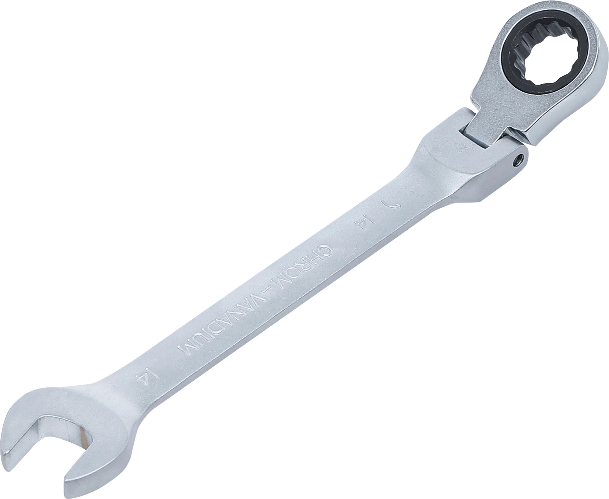 14 mm-es méretű csuklós kialakítású racsnis csillag-villáskulcs.
