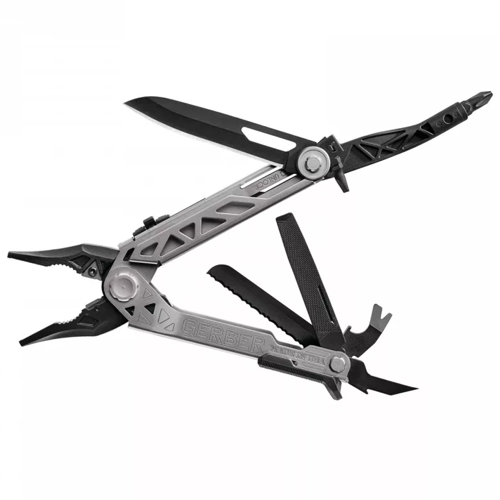 Funkciók: rugós nyitású hegyes fogó, kombinált fogó, drótvágó, egyujjas nyitás, 420HC penge, 3.25" központi tengely bit behajtó, vonalzó, üvegnyitó, feszítővas, szöghúzó, ár, reszelő, recés penge.