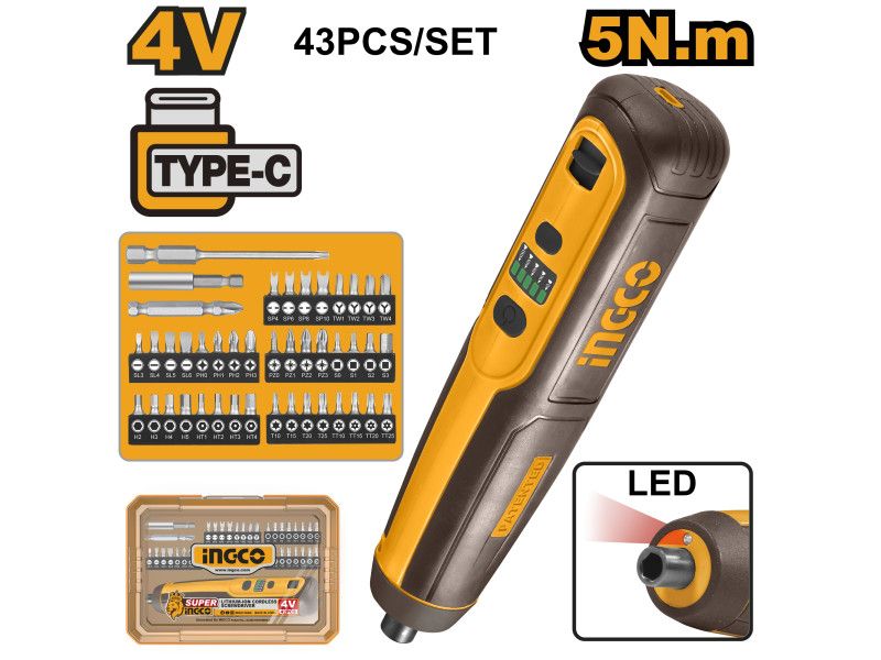 INGCO Akkus csavarozó 5 Nm 4 V + 43 részes bit (USB-C töltés)