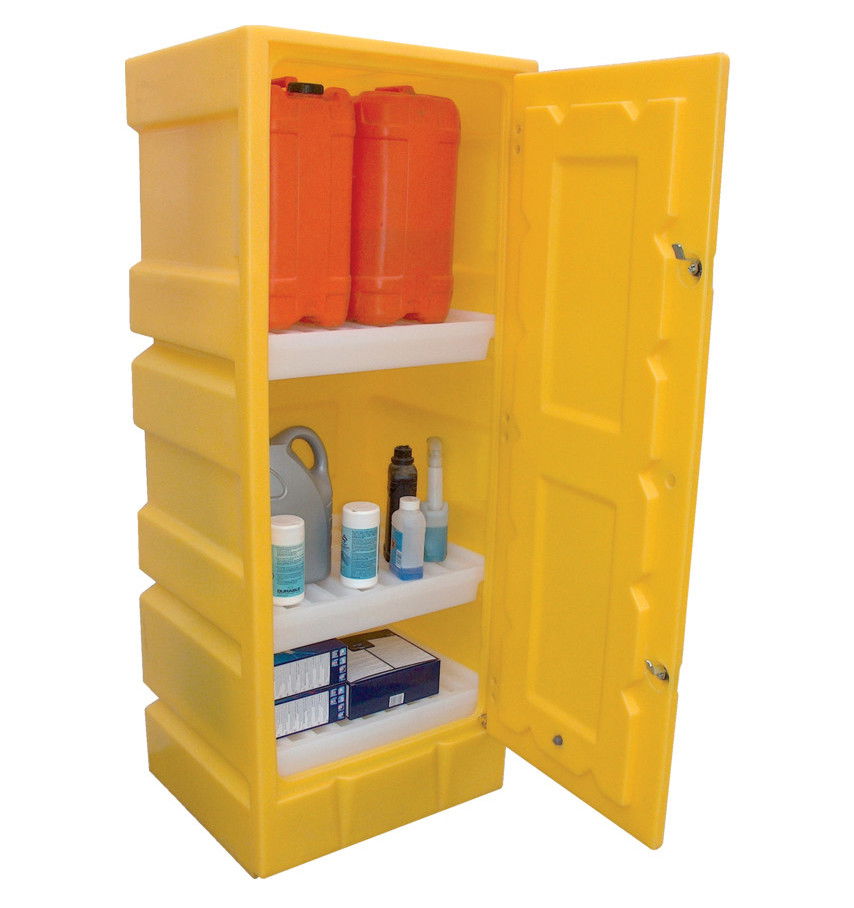 • Zárható műanyag tárolószekrény polcokkal.