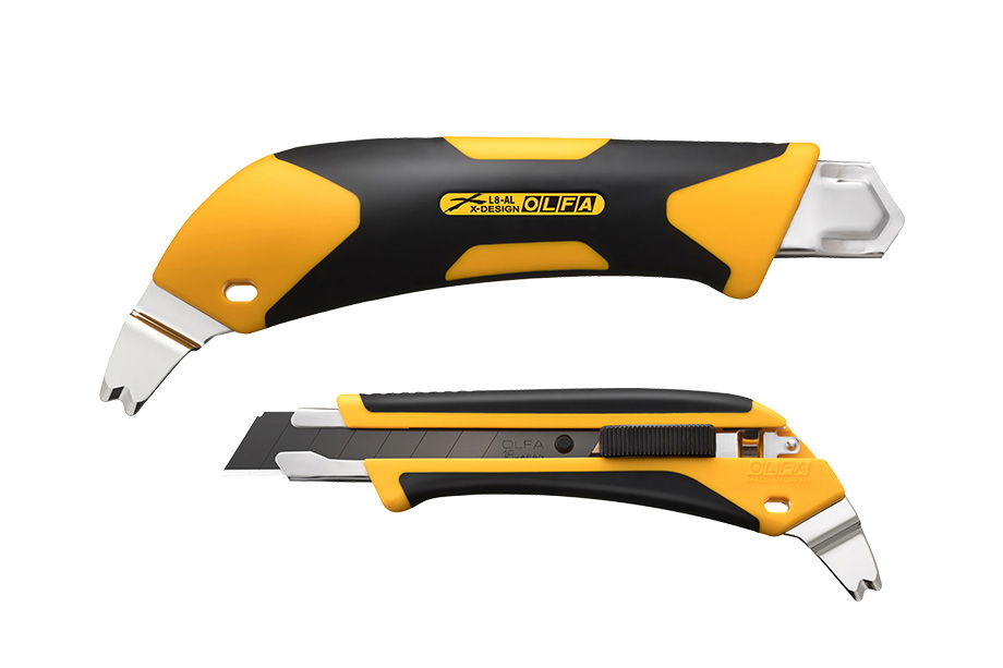 OLFA L8-AL - 18mm-es standard kés / sniccer. Nagy igénybevételre tervezett automata pengerögzítésű kés. Csúszásmentes markolata üvegszállal erősített. A kés végén egy új, 1,2 mm vastag keményacélból készült, profilozott fül található mely, nemcsak tűző és ipari kapcsok eltávolításánál vagy festékdobozok kinyitásánál szolgálhat segítségül, hanem sérült csavarrögzítés kihajtásakor is. A kés ExcelBlack pengével szerelt.